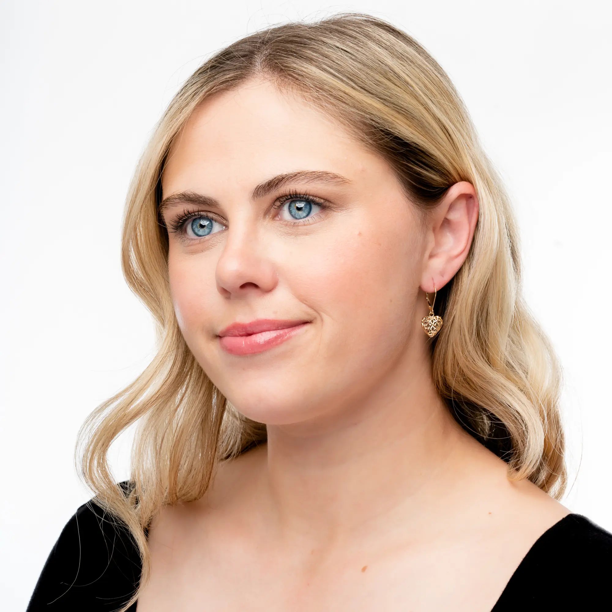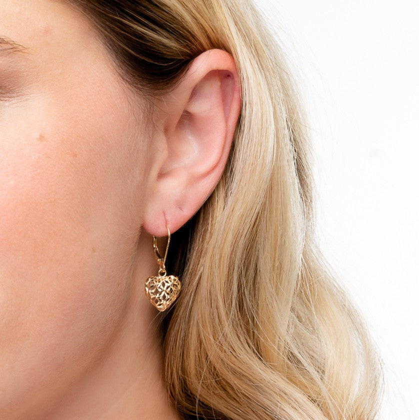 Hearts that dance with detail. The Lattice Heart Dangles in solid 14k gold feature a delicate filigree design and a 24mm drop that’s lightweight, secure, and made for every day.