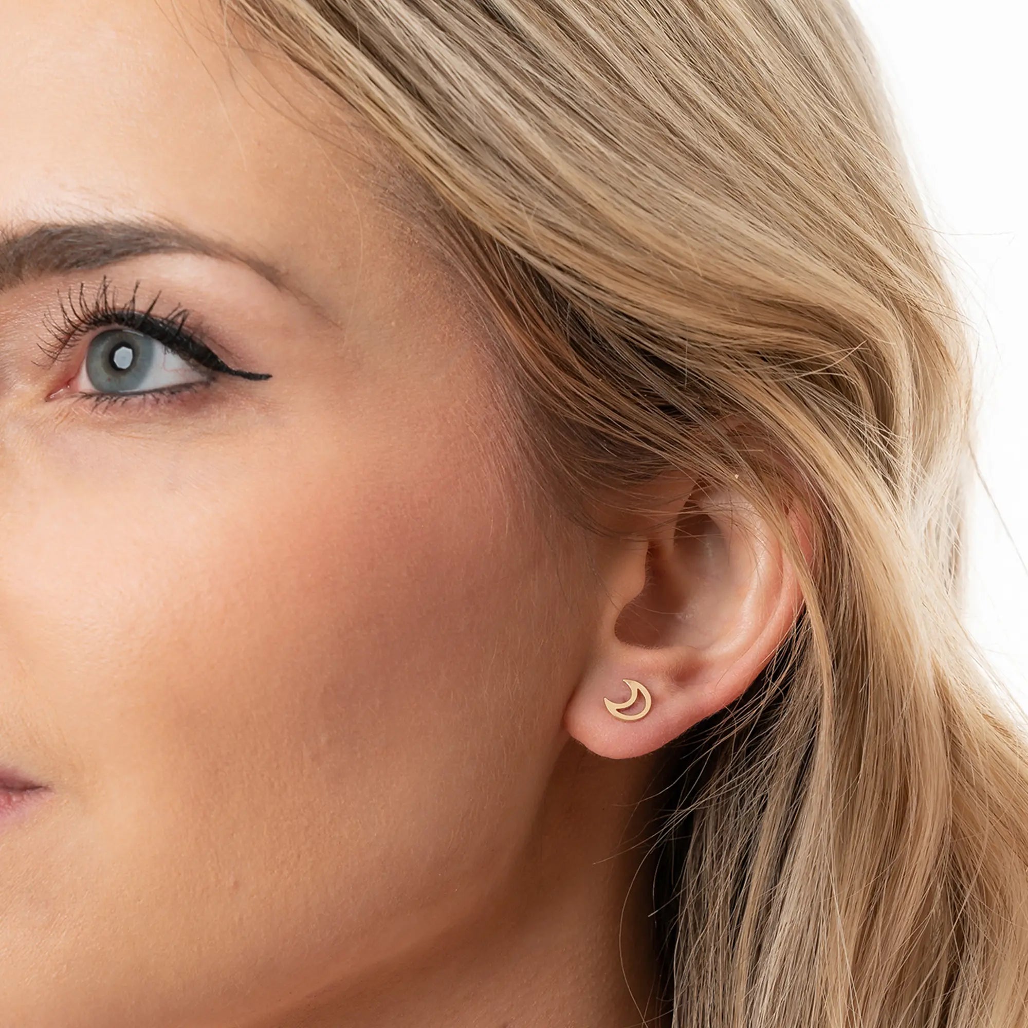 To the moon and back. The Crescent Studs in solid 14K gold bring a sleek 7.5mm moon silhouette that’s timeless, minimal, and made for every day.