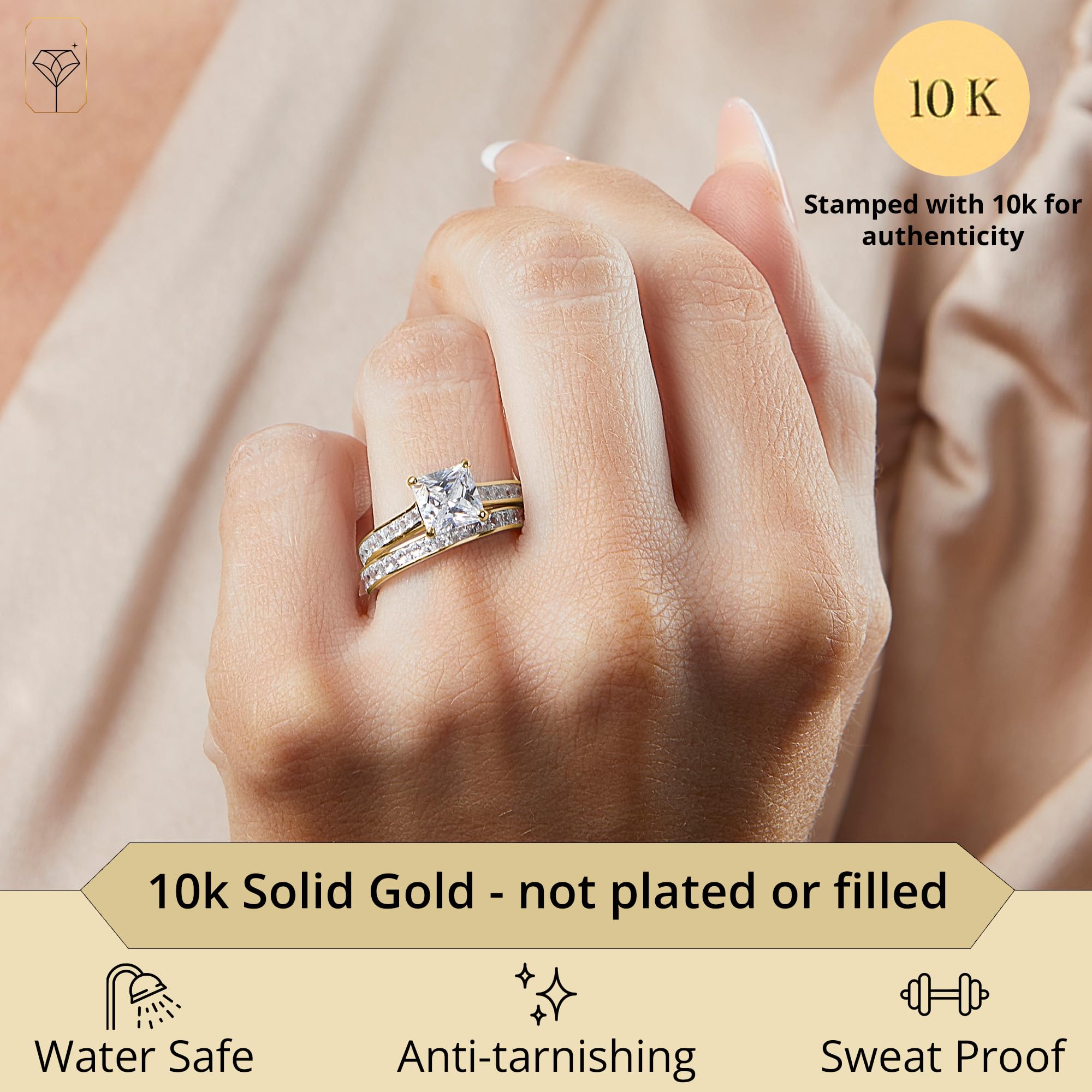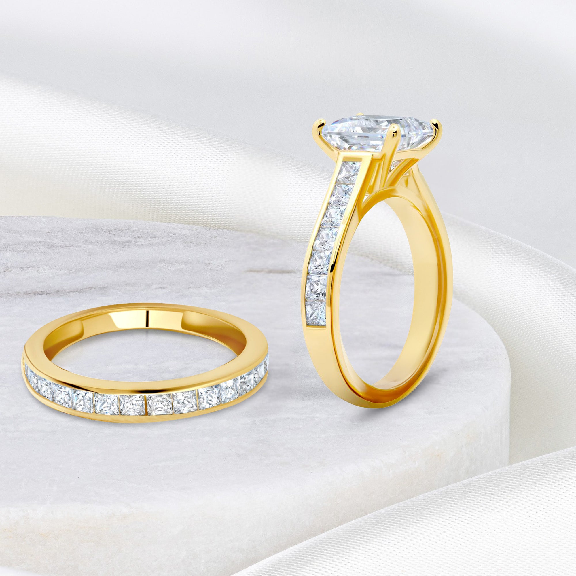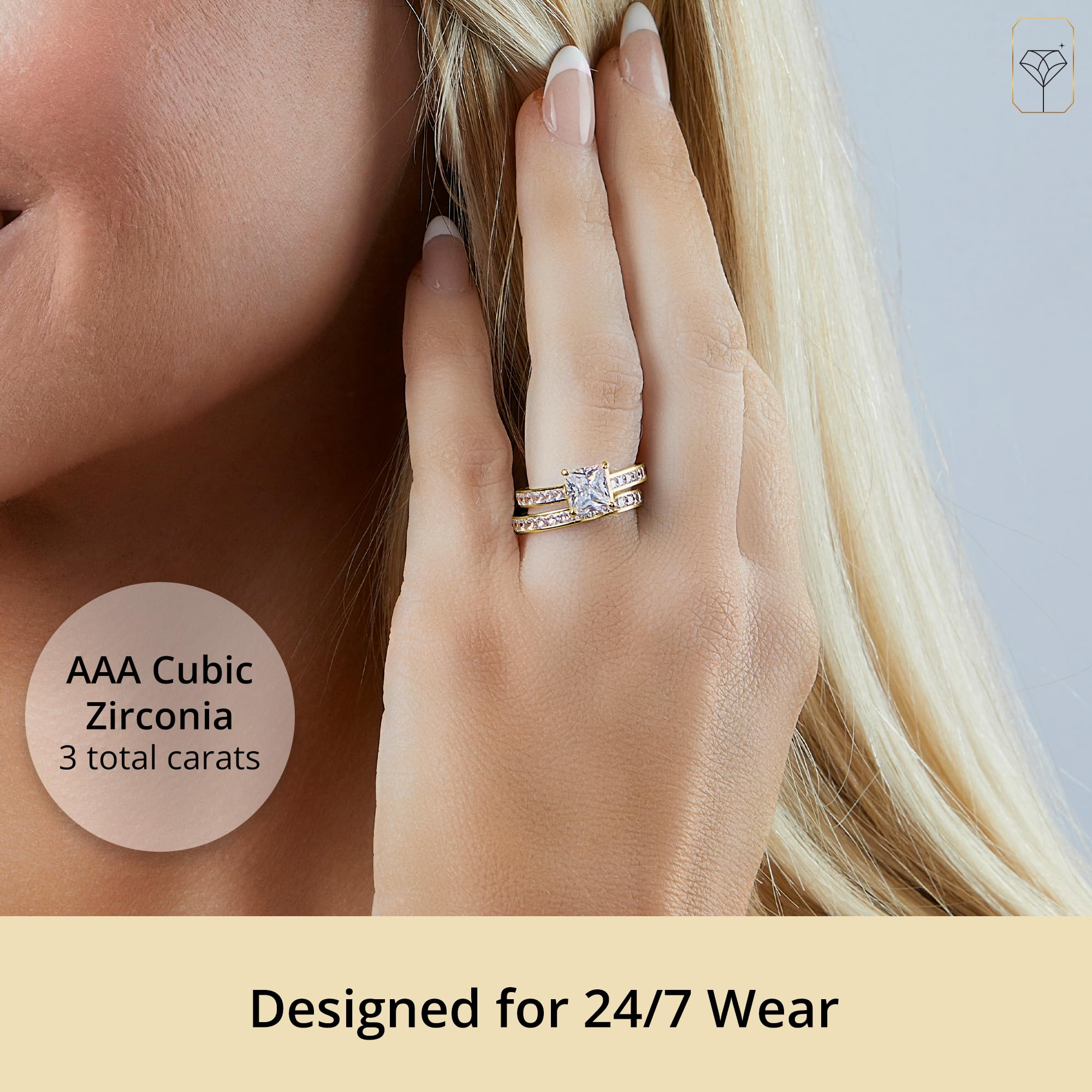 Two pieces, one promise. A brilliant 3 carat cubic zirconia engagement ring meets a coordinating eternity band, both crafted in solid 14k gold for a lasting symbol of love.