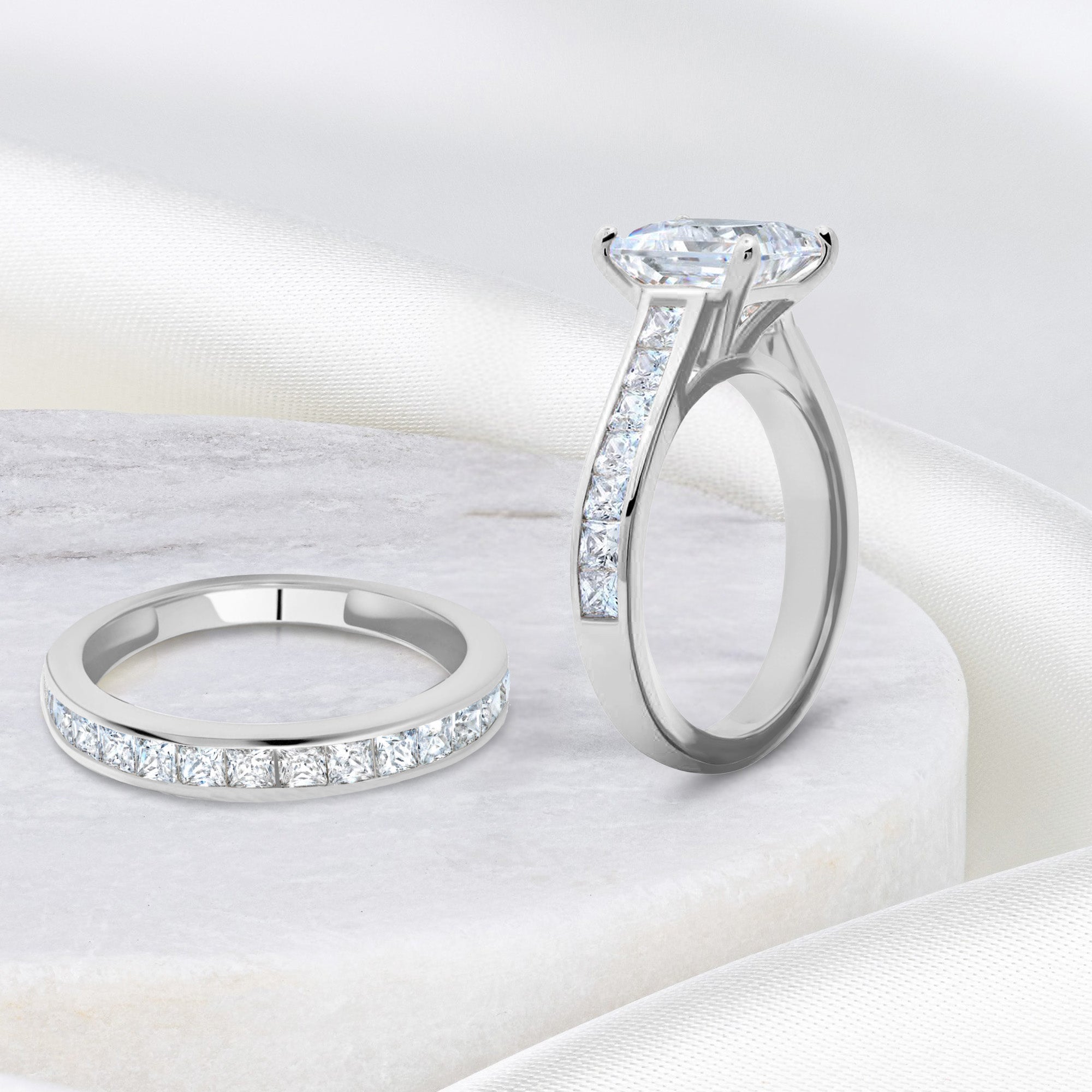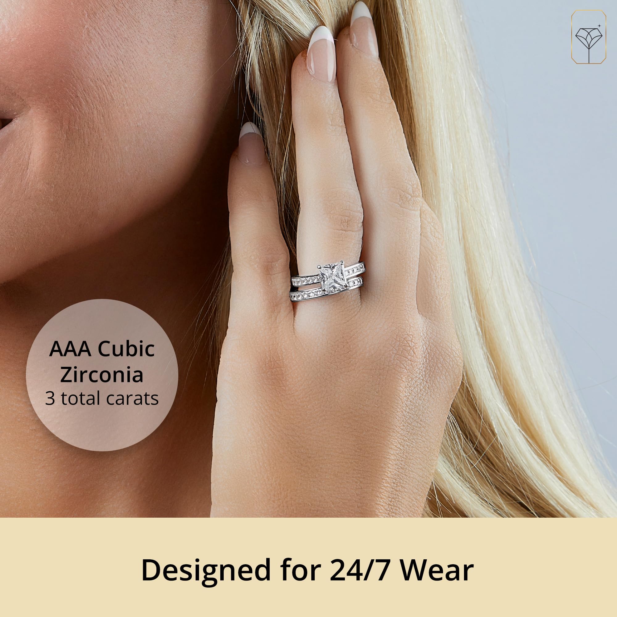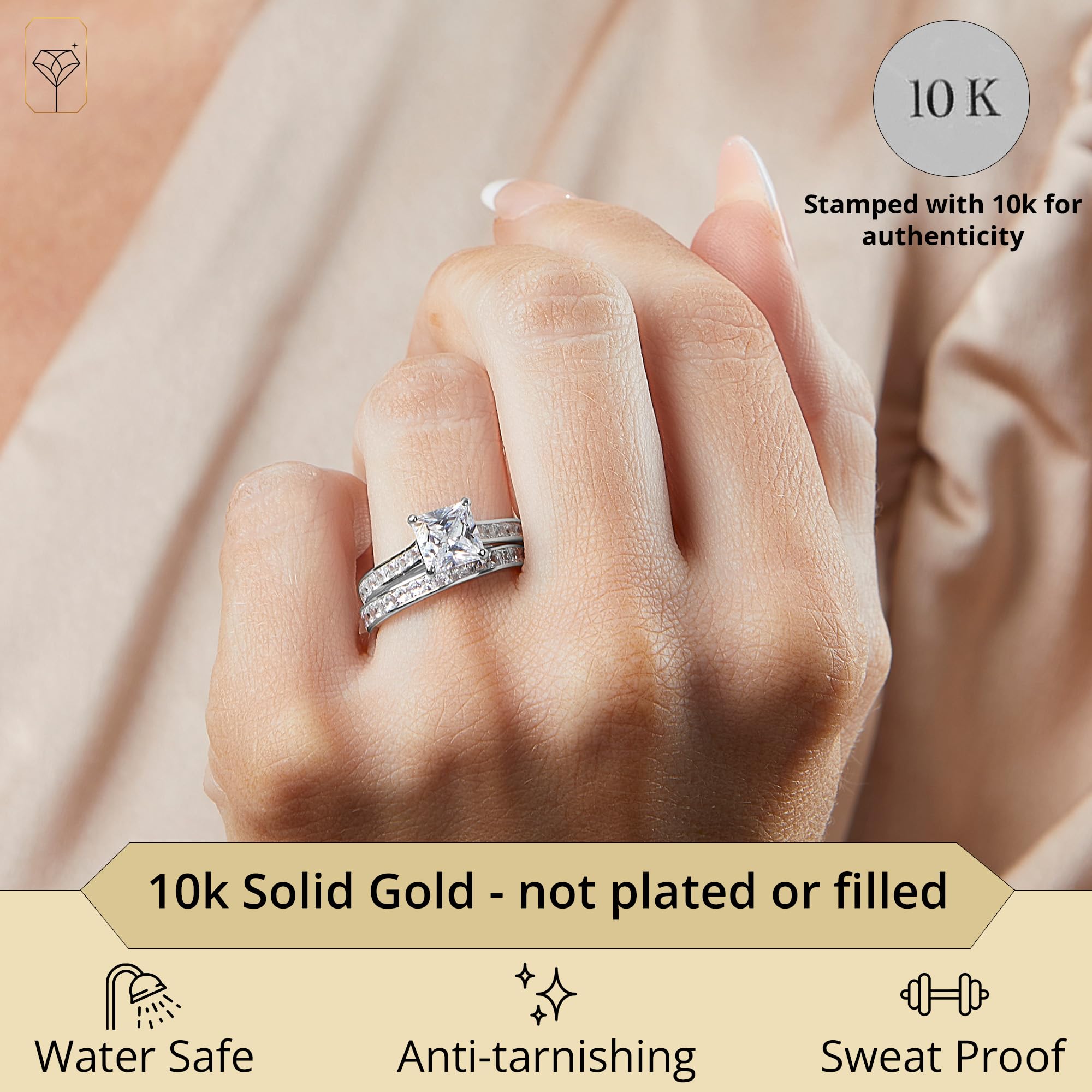 Two pieces, one promise. A brilliant 3 carat cubic zirconia engagement ring meets a coordinating eternity band, both crafted in solid 14k gold for a lasting symbol of love.