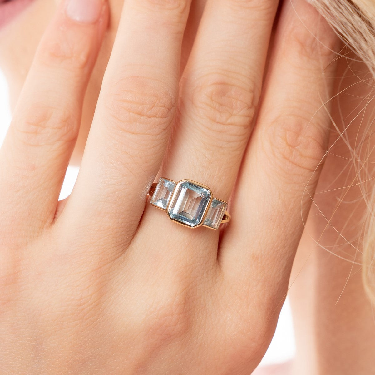 As bold as the sea and as radiant as the sky, this three-stone ring stuns with a 2ct emerald-cut blue topaz flanked by brilliant side stones. Set in solid 14K gold, it’s a statement of strength, elegance, and unforgettable style.